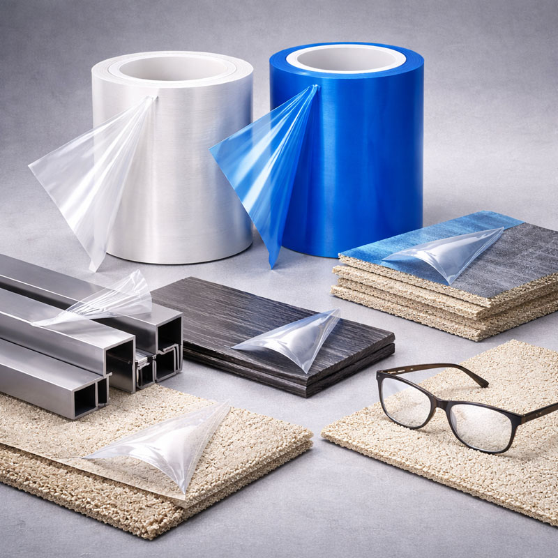 Our protective films are mainly made from PE (polyethylene) and PET (polyester), paired with pressure-sensitive adhesives.